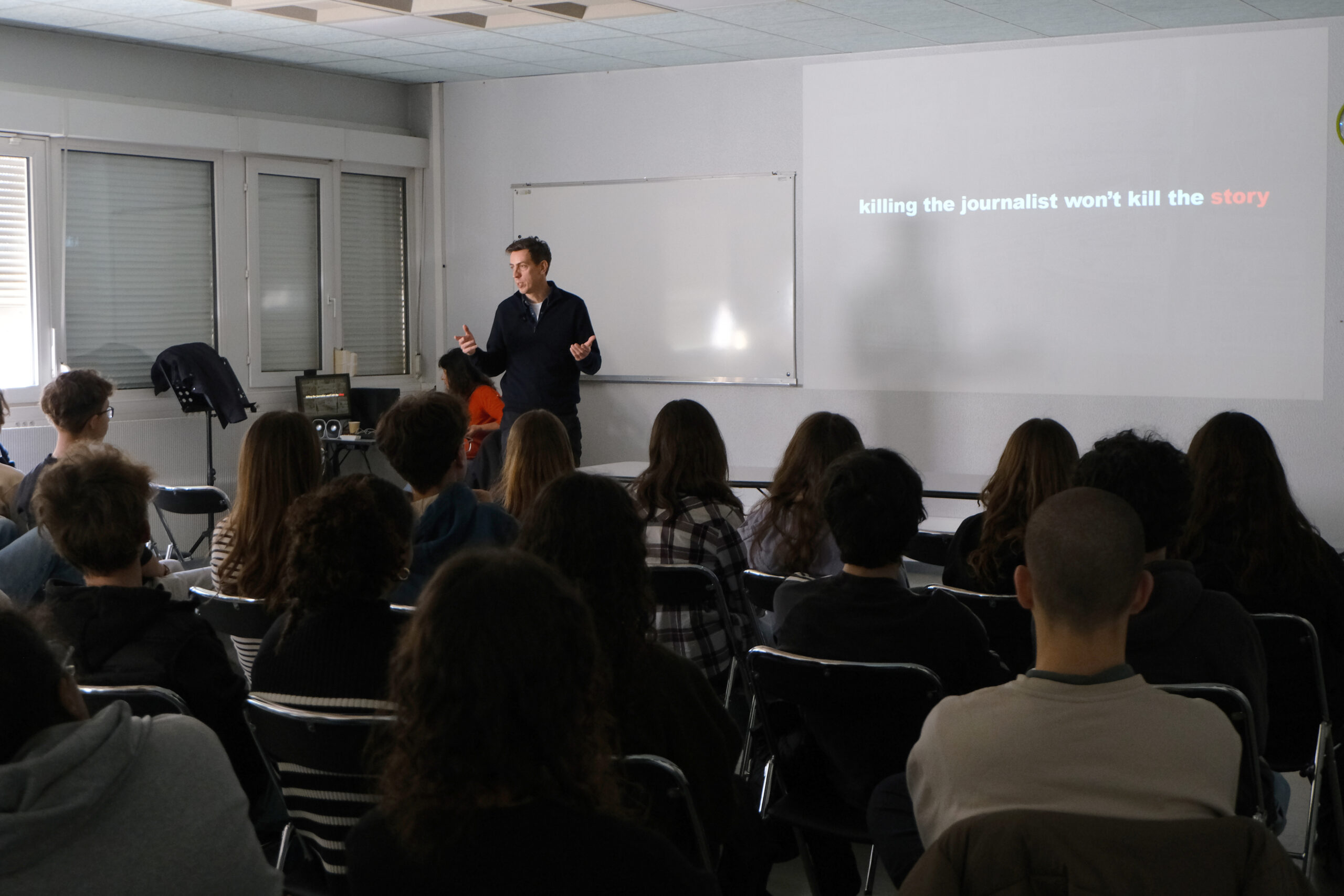 Il a expliqué aux élèves que l’année 2014-2015 marque un tournant dans sa carrière. En effet, alors qu’il suivait le président Hollande en Azerbaïdjan dans le cadre du documentaire Mon président est en voyage d’affaires, une amie journaliste l’informe qu’il risque d’être arrêté pour son travail d’enquête. Elle-même finit emprisonnée pendant plusieurs mois pour son travail sur la corruption du régime, et, depuis sa cellule, l’incite à publier son enquête malgré tout. Quelques temps après, Laurent Richard est l’un des premiers à arriver sur les lieux de l’attentat contre Charlie Hebdo, ses voisins de palier, venant en aide aux survivants. Cet enchaînement d’événements le mène à se questionner sur ce qu’il peut faire pour contrer les réseaux souhaitant réduire les journalistes au silence.
