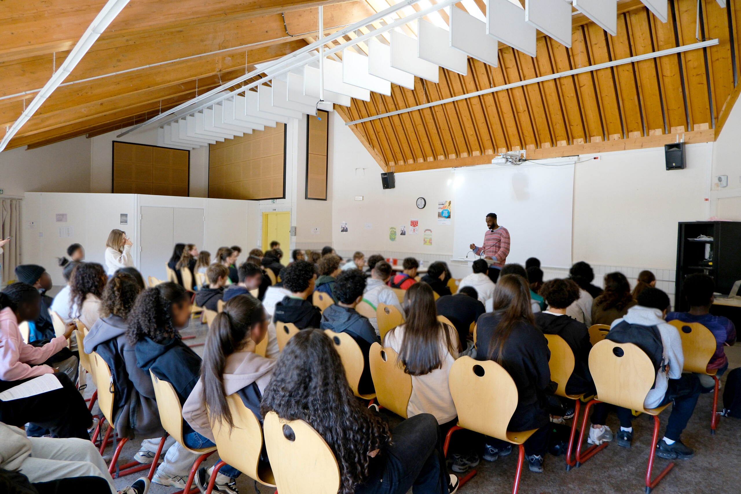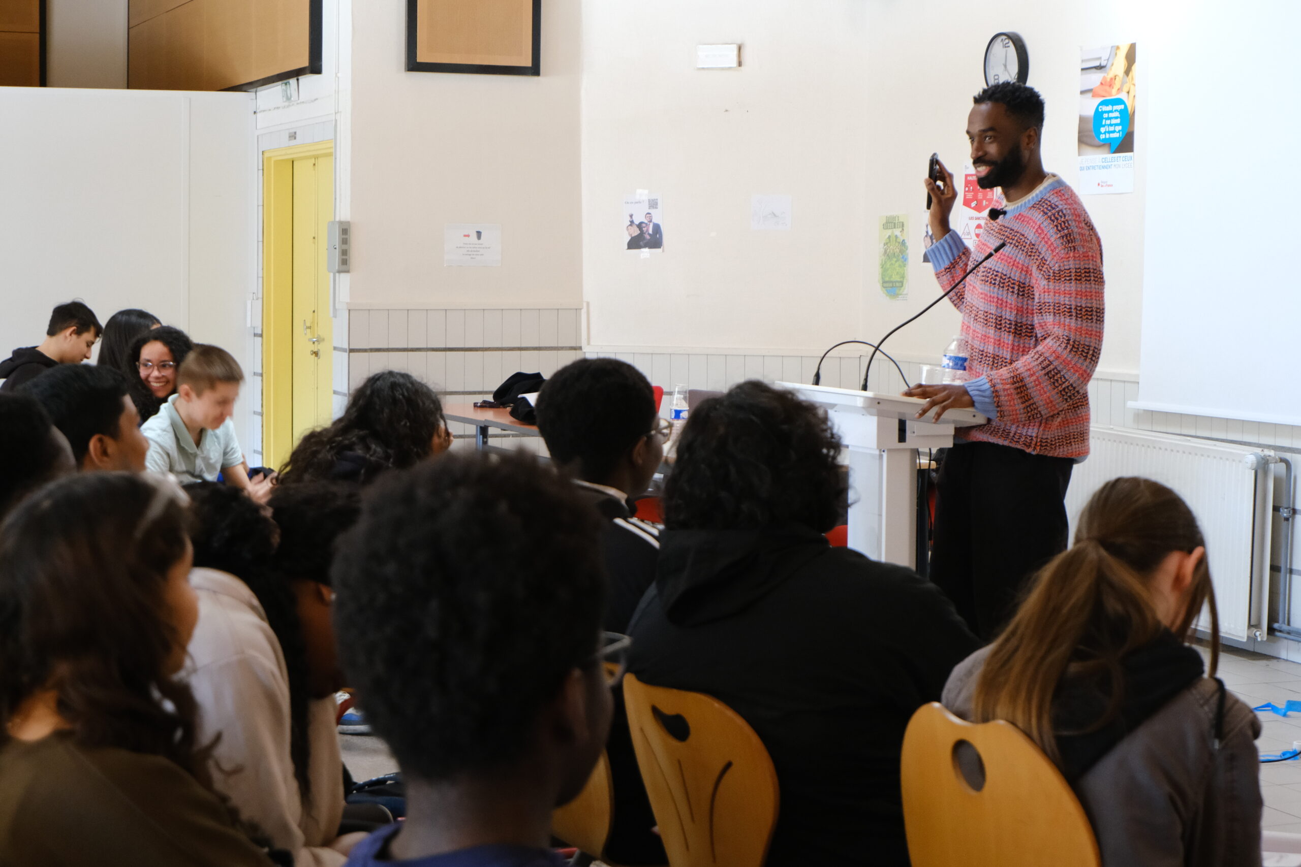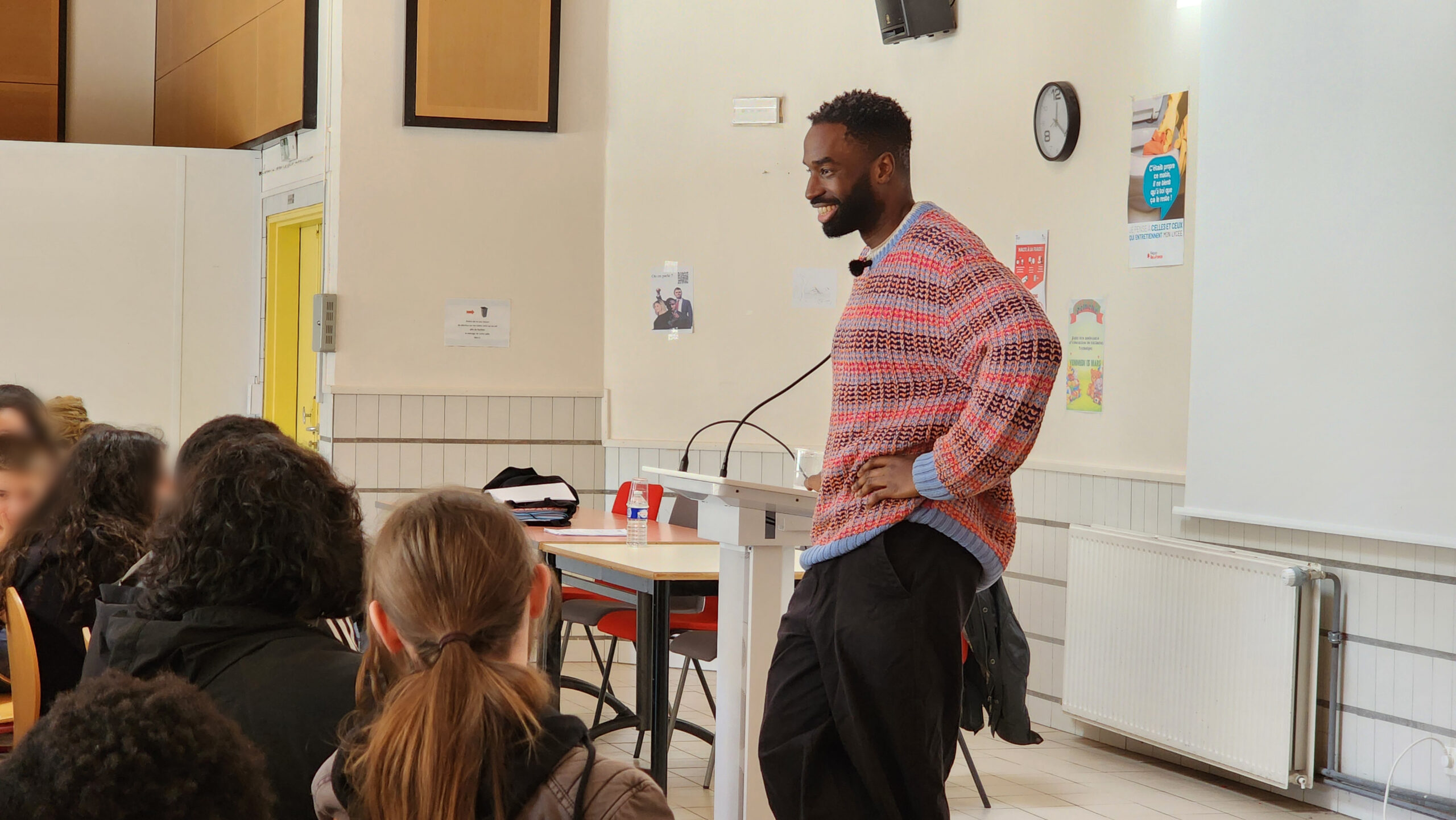 Impressionnés par son parcours, les élèves lui ont demandé par où commencer si on souhaite travailler dans le milieu du cinéma. Il a commencé par insister sur la diversité des métiers dans ce secteur, les différentes formations possibles et les dispositifs d’accès comme les programmes d’Égalité des chances (Fondation Culture et Diversité). Il leur a aussi parlé du système de l’intermittence du spectacle et conseillé de postuler en régie sur les plateaux de tournage, afin de se former sur le terrain tout en étant rémunéré.